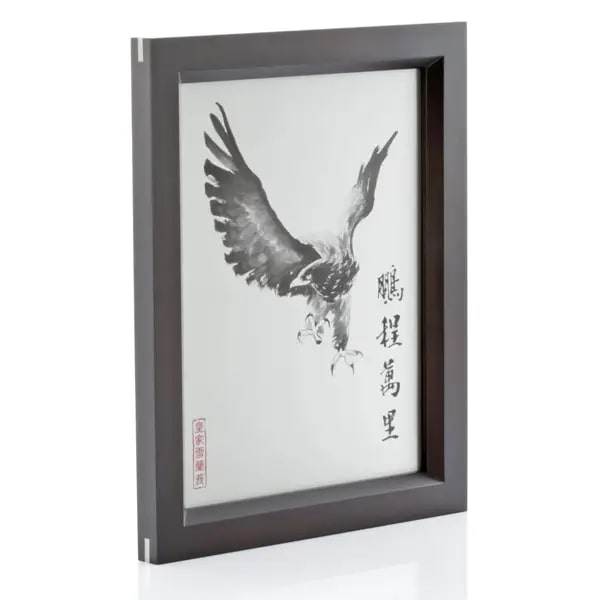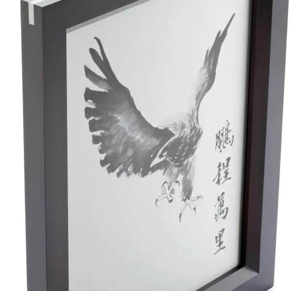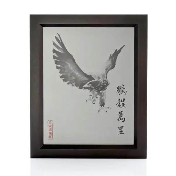 雄鷹以富有表現力的水墨風格蝕刻於錫鑞上,配以“鵬程萬裡”字樣,字面意思是大鵬展翅翱翔萬裡,賦予了這只猛禽以神鳥的奇幻特質。