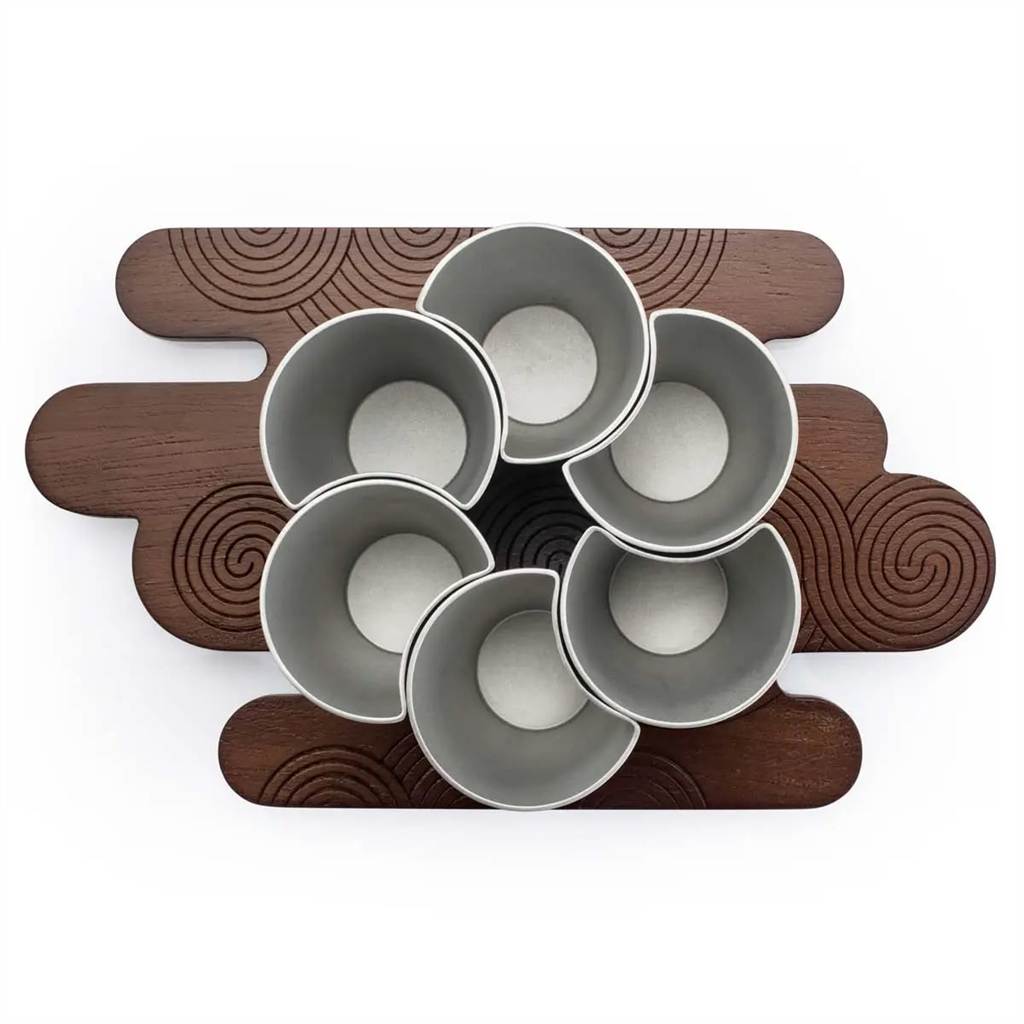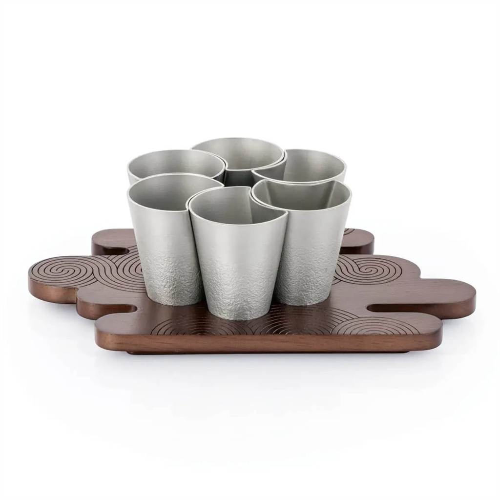 • 六只多紋理錫製茶杯,配以竹製雲朵托盤。