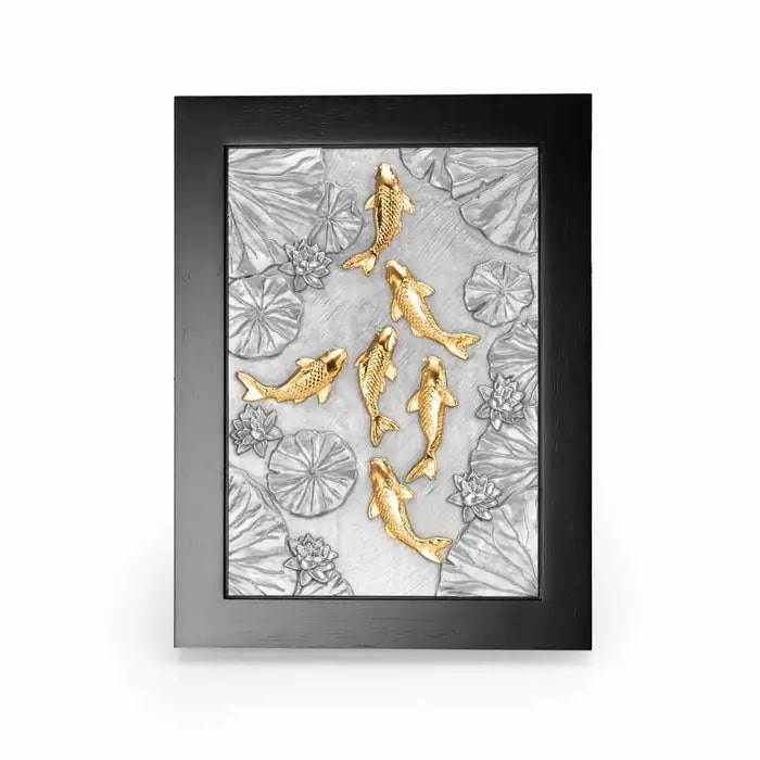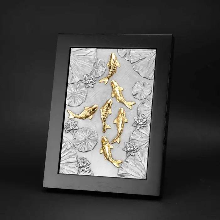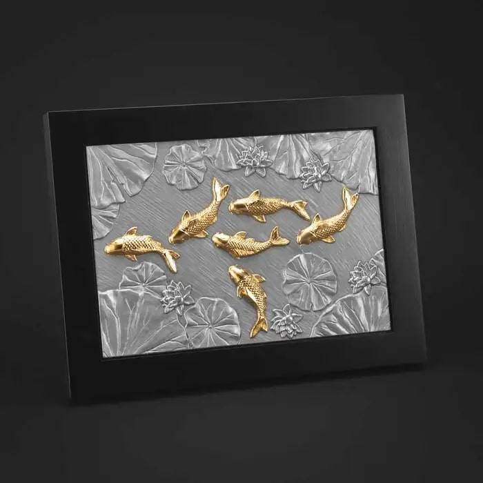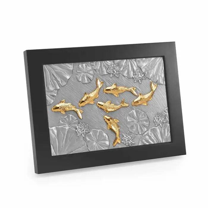 在中國文化中,數字六被視為吉利,象徵順利進步和成功。這塊牌匾完美地捕捉了這一象徵意義,六條錦鯉在蓮花間優雅地游弋;24K金的鱗片在遊動時反射著光芒。