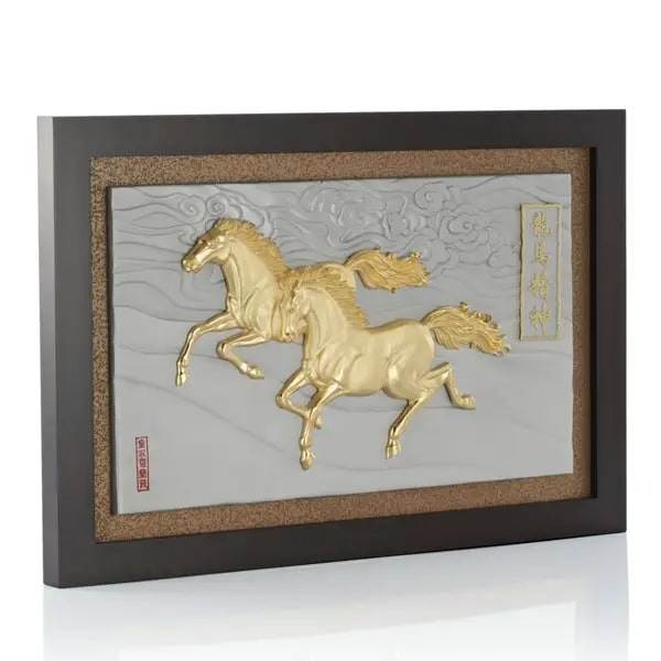 一對雄健的駿馬,象徵著成功的到來,在夢幻般的天空和雲彩背景下奔騰不息,象徵著光明和充滿希望的未來。 「龍馬精神」這幾個字,象徵正值壯年之人的活力與朝氣。奢華的24K金更增添了這塊華麗的牌匾。